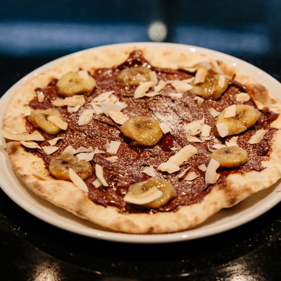 Plátano (banana), canela en polvo, gotas de leche condensada y queso mozzarella